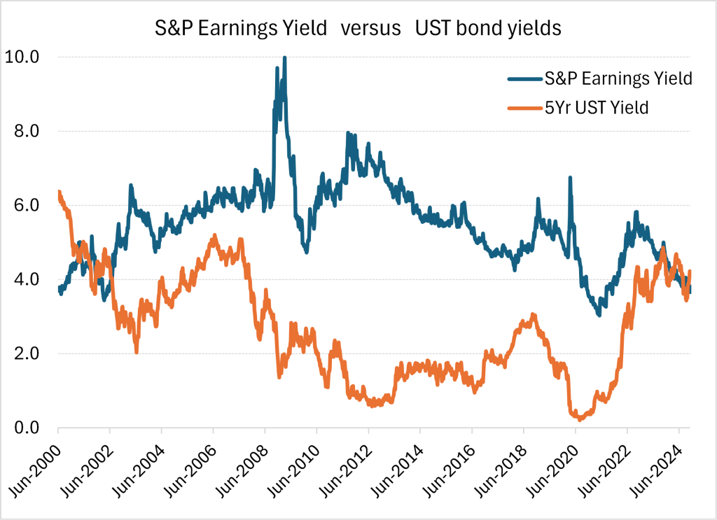 Equity market indices are setting all-time high records every month. It is as if the market believes that a growth slowdown is definitely not going to happen. Forget “Soft-landing” scenario; people are now tilting towards a “No-landing”. However, valuations also seem to be pricing-in a no-landing scenario already. The chart below shows the 5-year UST yield versus the S&P 500 Index’s earnings yield (E/P, which can be viewed as 1 / (P/E) ). With S&P 500 now trading at 25x P/E, the 5-year UST yield is higher than S&P 500’s earnings yield, meaning that you get paid more by bonds than the companies are earning for you on your stocks. This has rarely happened before. The last time it happened was in 2000, after which stocks were down 45% in the following 2 years.
